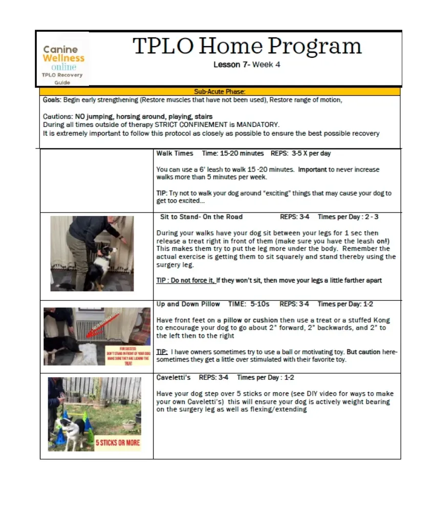 Every week of TPLO recovery looks different. This is what the course covers for each of the first four weeks post-surgery.